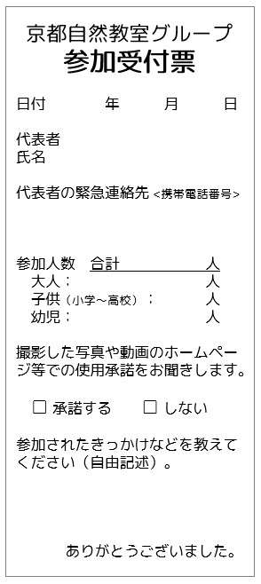 参加申し込みは不要です。観察会当日、集合場所に以下の参加受付票をダウンロードして必要事項を記入してご持参ください。集合場所では受付スタッフに受付票と参加費をお渡しください。