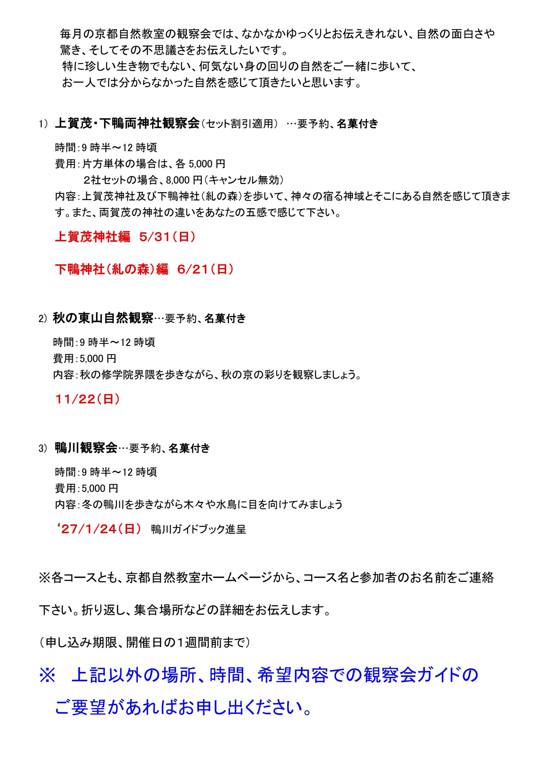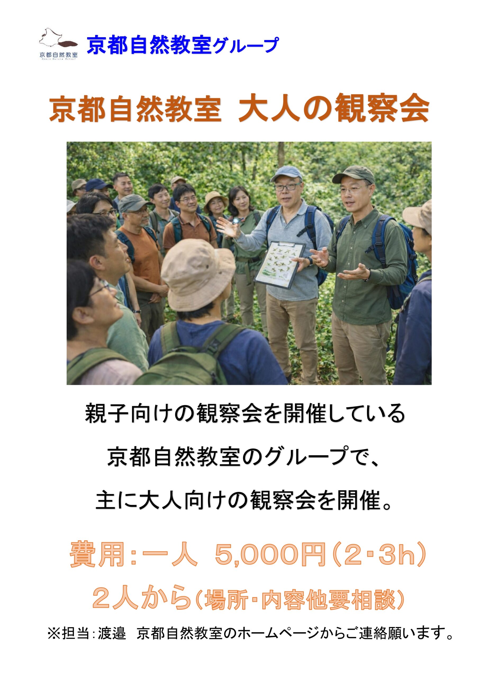 京都自然教室 大人の観察会 京都自然教室 大人の観察会 普段の観察会では伝えきれない自然の面白さや驚き、不思議さをお伝えします。特に珍しい生き物でもない、何気ない身の回りの自然をご一緒に歩いて、感じる観察会です。 【活動の目的】 自然、特に植物を中心にネット上及び野外で、その自然の魅力や驚き・不思議さをお伝えしようと思います。 【活動の頻度】 年複数回、不定期 【代表者】 渡邉健也 【2026年の観察会予定】・・・パンフレットをクリックするとPDFファイルをダウンロードできます