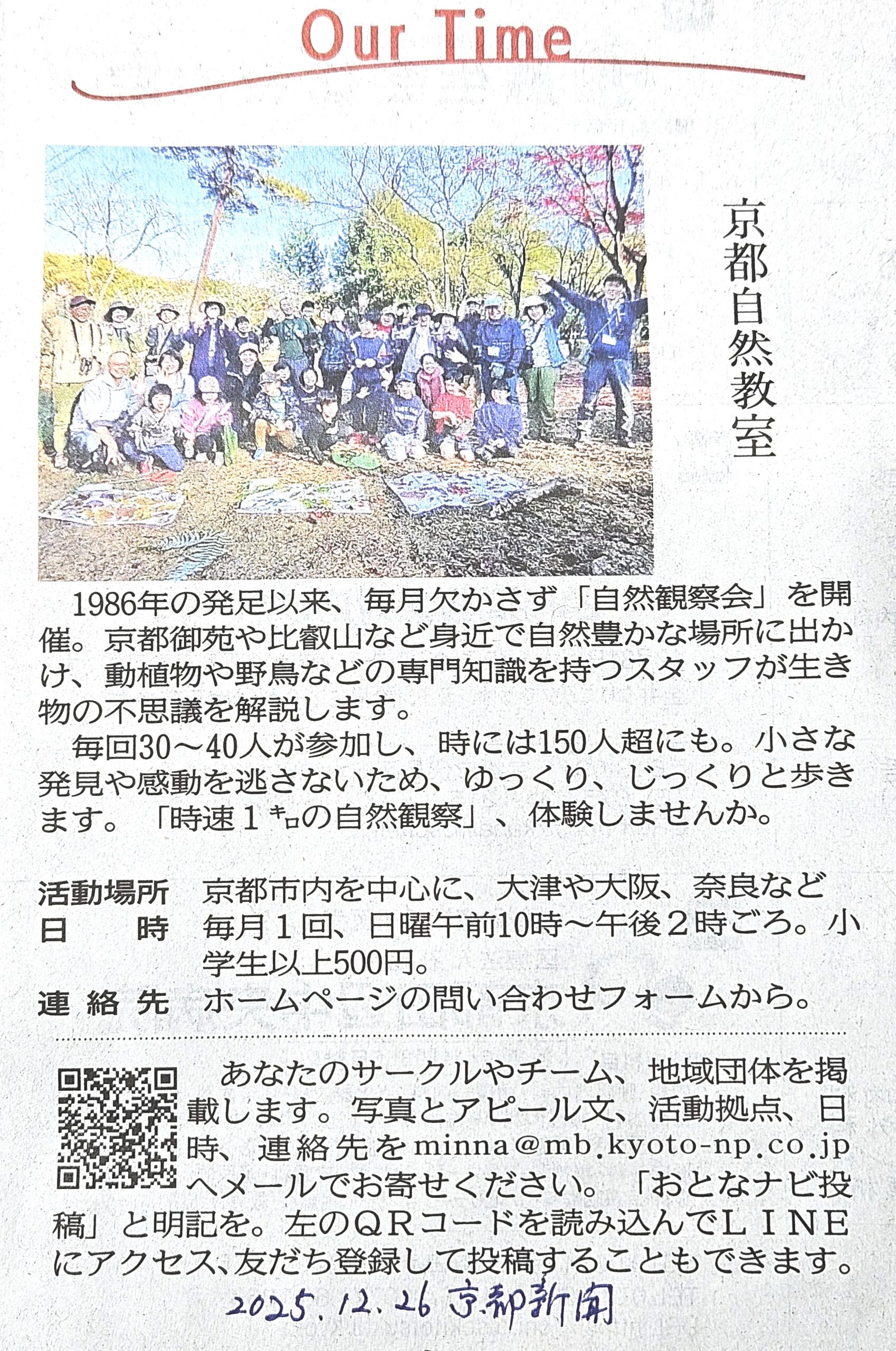 2025年12月26日の京都新聞に京都自然教室の活動が紹介されました。写真は2025年11月30日に開催した「紅葉・黄葉を観察しよう」(嵐山、小倉山)での写真です。